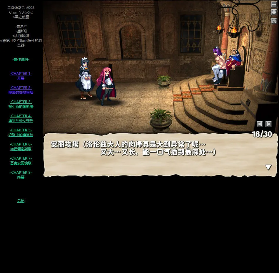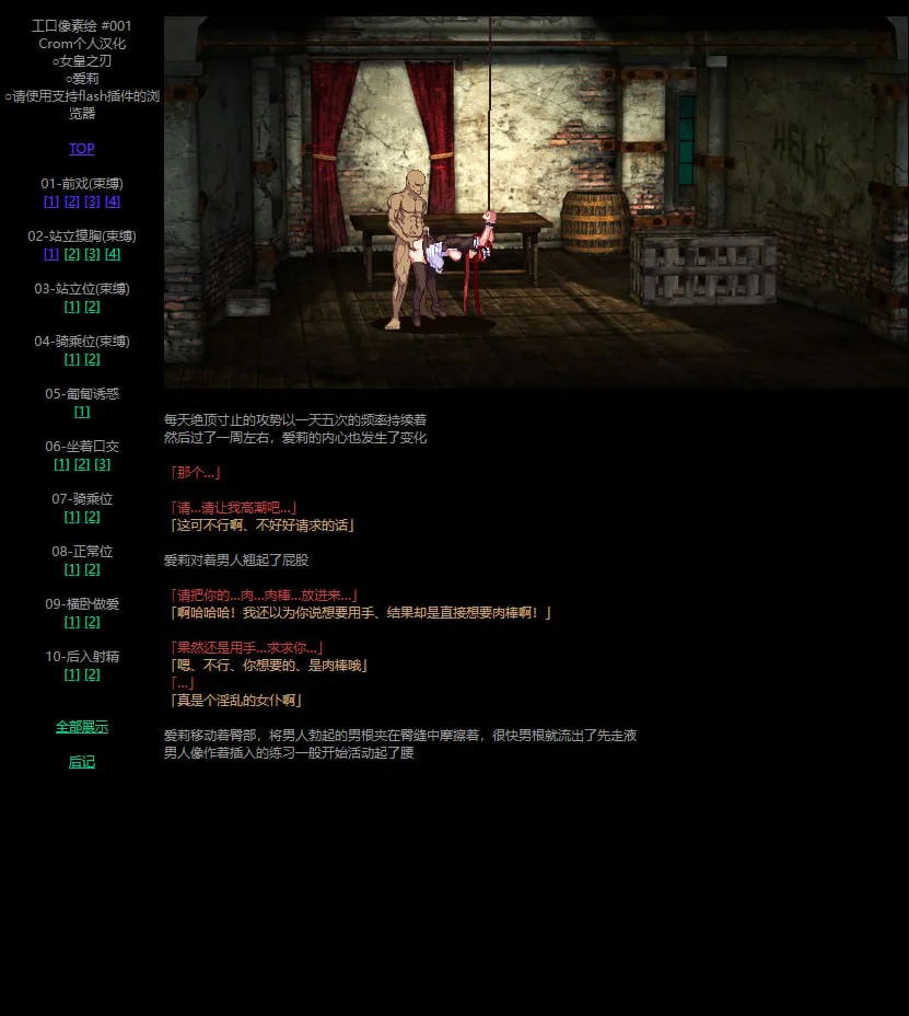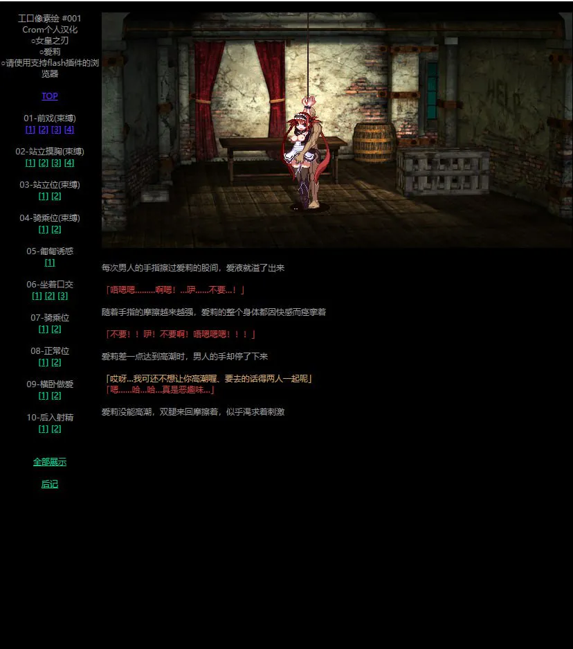 与其说是游戏,不如说是HAG,主要就是观看人物被各种凌辱和调教。虽然是像素,但玩过《飞行公主》和《西诱记》的童鞋都应该清楚这个社团的质量。